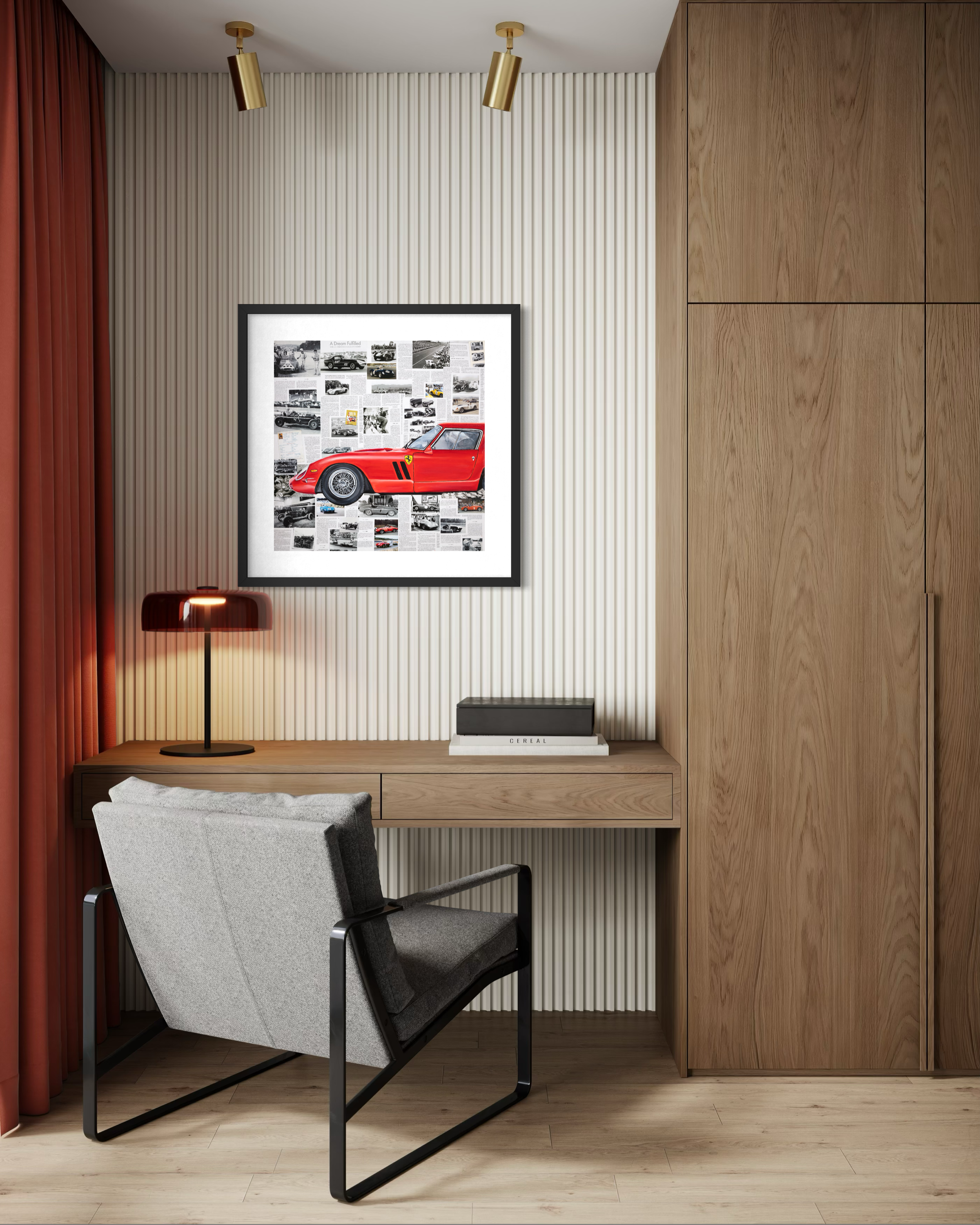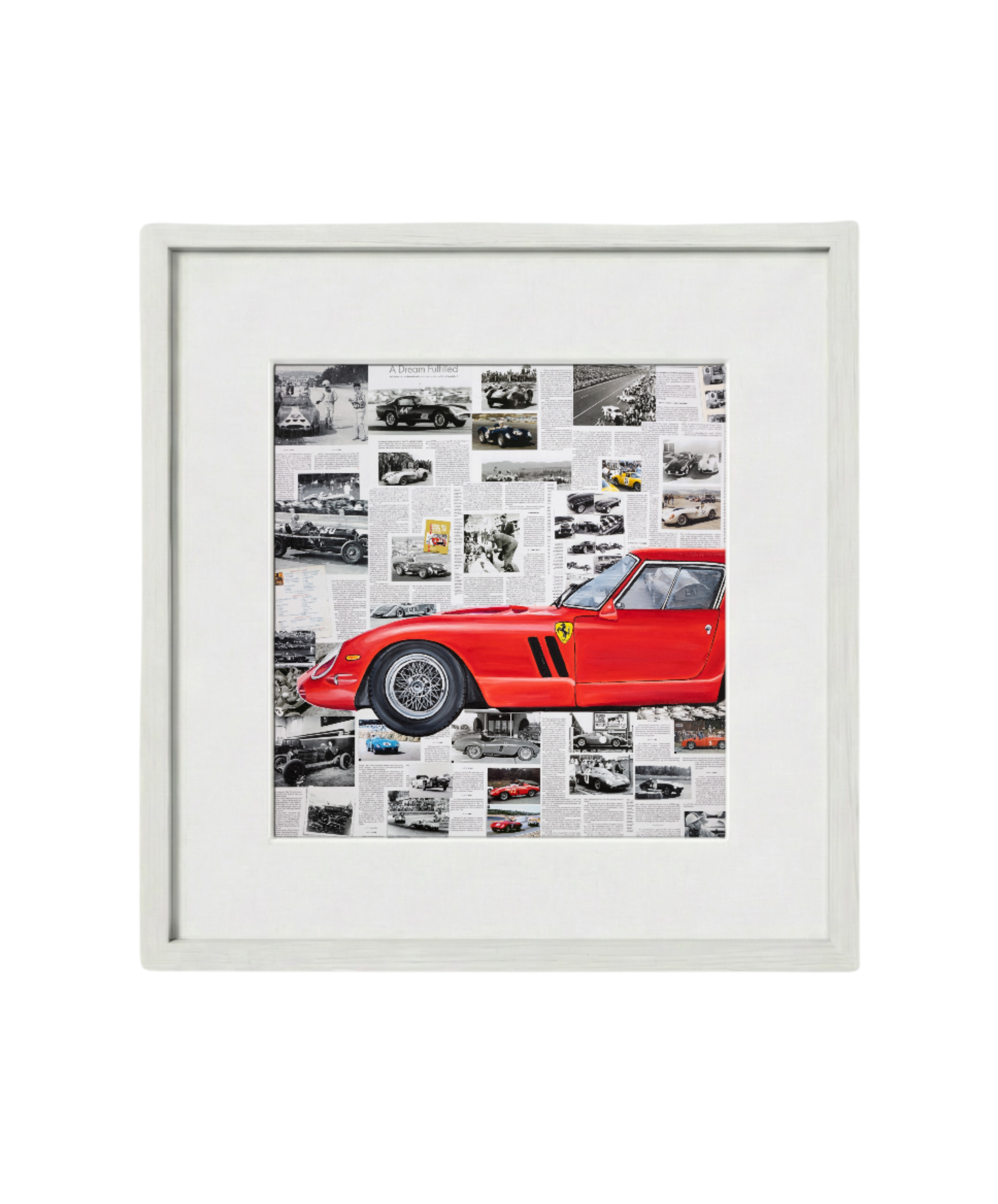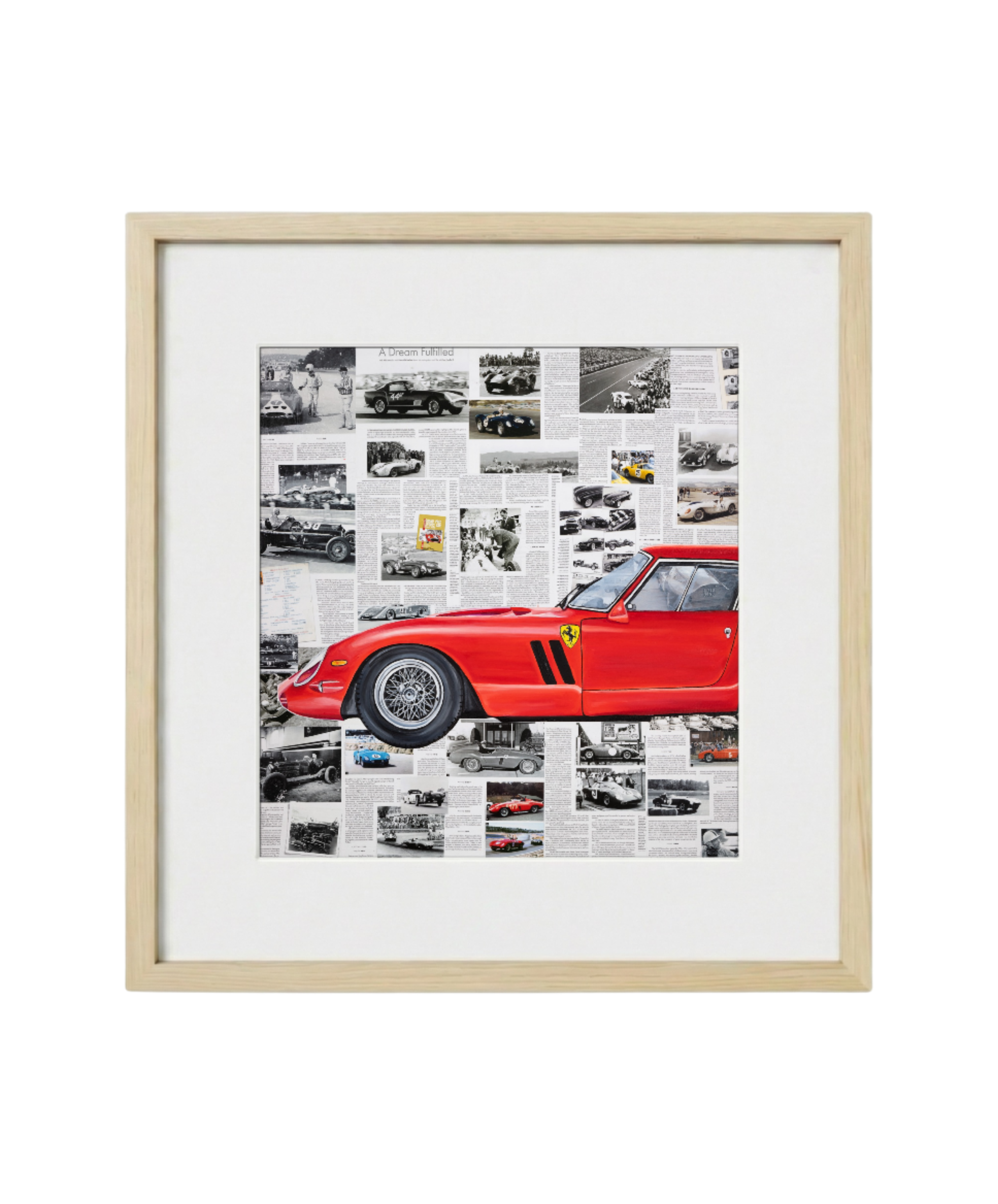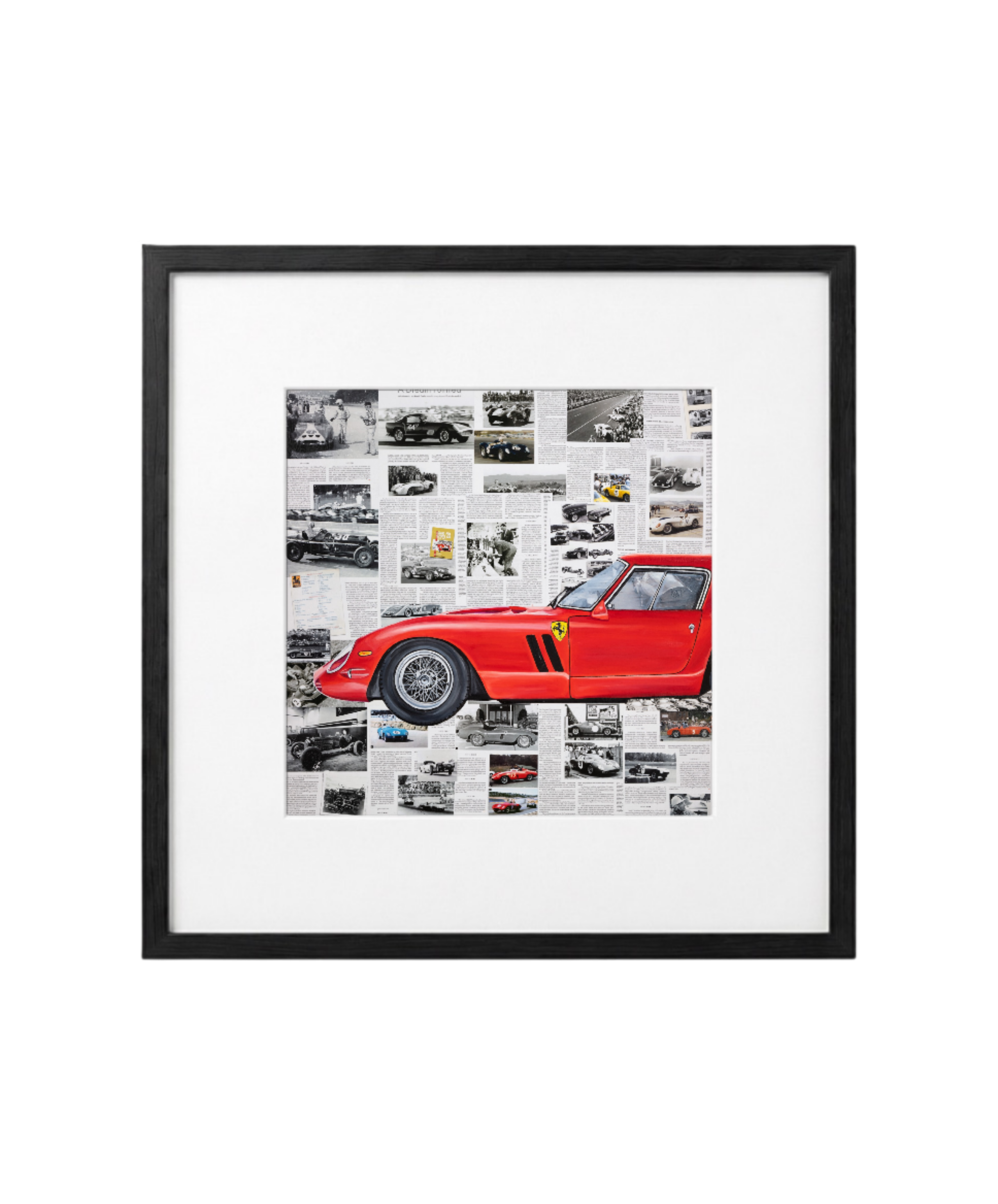 A tribute to one of the most legendary cars in automotive history, Ferrari 250 GTO captures the essence of speed, prestige, and timeless Italian design. The vivid red profile of this iconic Ferrari stands out against a collage of vintage racing imagery and historical articles, celebrating the brand’s rich motorsport heritage. Perfect for car enthusiasts and collectors, this dynamic piece combines art and engineering excellence, embodying the thrill, elegance, and legacy of Ferrari.
